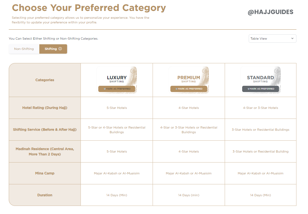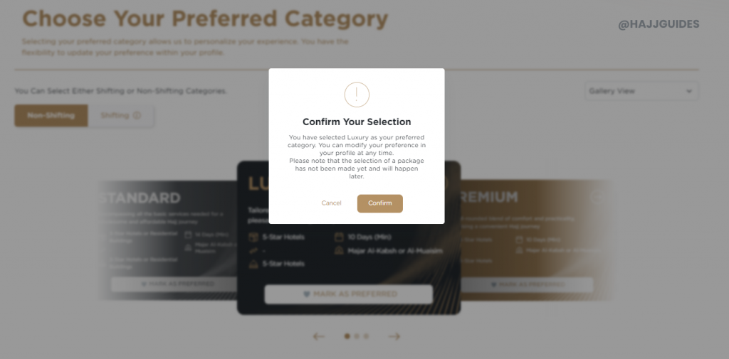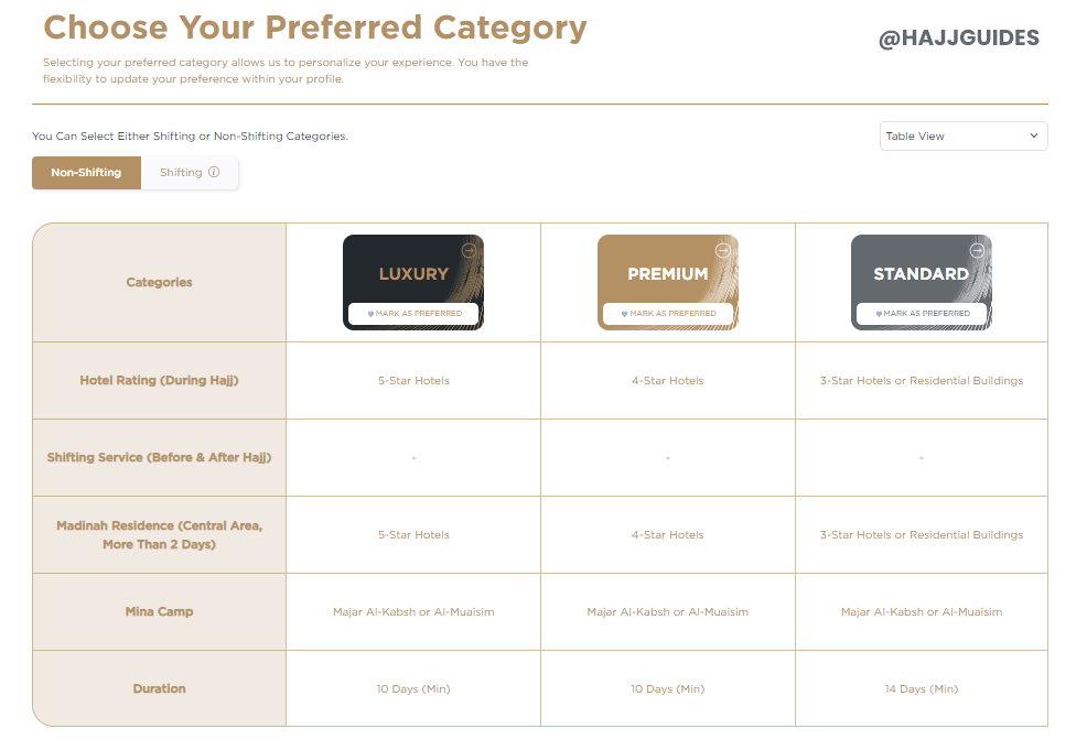Nusuk Hajj Registration Step No. 5 > Select Preferred Package (Select whether your preferred package is “shifting” or “non-shifting” and the packages type, Standard, Premium or Luxury. Completion of this step is mandatory; however, there are no restrictions on the type of package you may select.