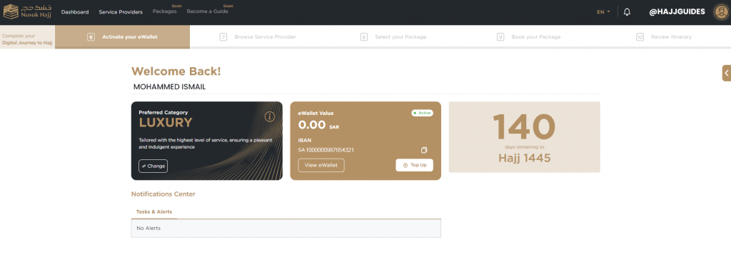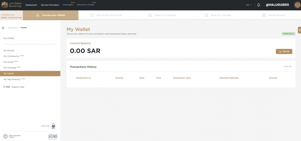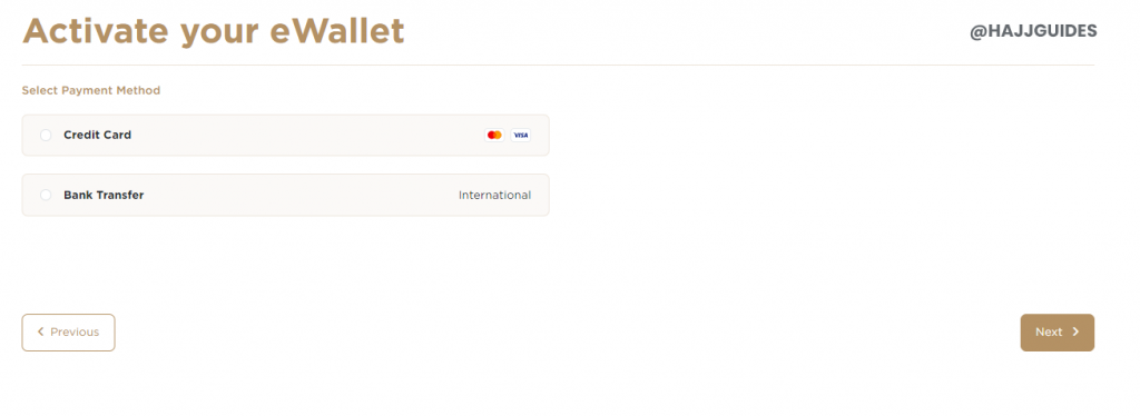 Nusuk Hajj Registration Step No. 6 > Activate your eWallet in readiness to transfer funds for when packages are released.