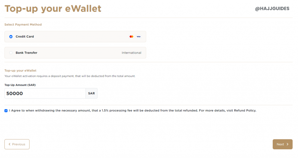Note: Your bank and card vendors may charge a fixed fee or a percentage of the total amount as foreign transfer fee. We advise you to shop around as these figures could add up significantly. As per Nusuk T&C’s, you may withdraw funds you have topped up, however, a 1.5% processing fee +VAT will be deducted from the total refunded.